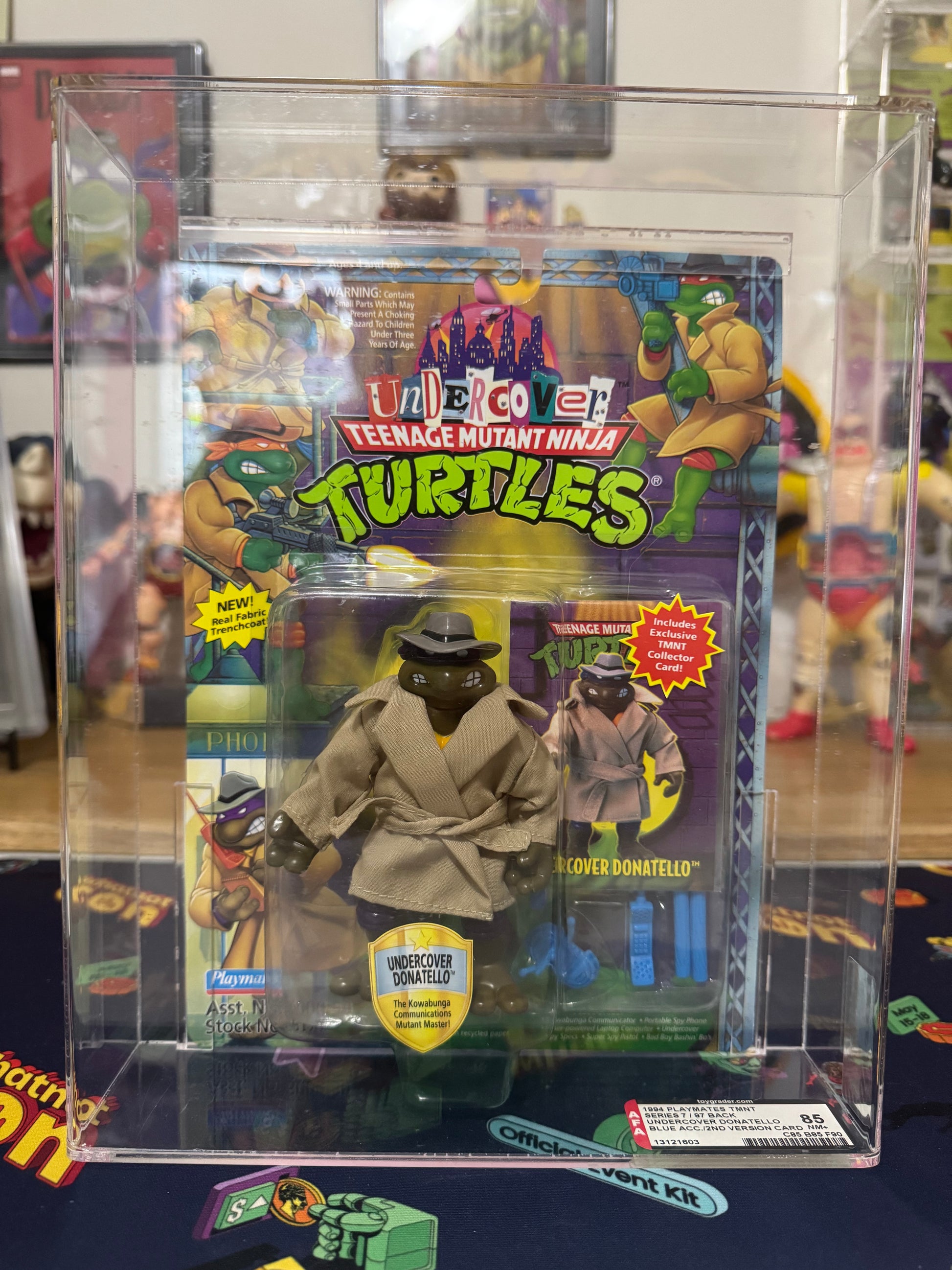 Step into the shadows of 1994 with one of the most legendary Teenage Mutant Ninja Turtles action figure variants ever produced—the elusive Cloth Coat Undercover Donatello, professionally graded AFA 85 NM+.